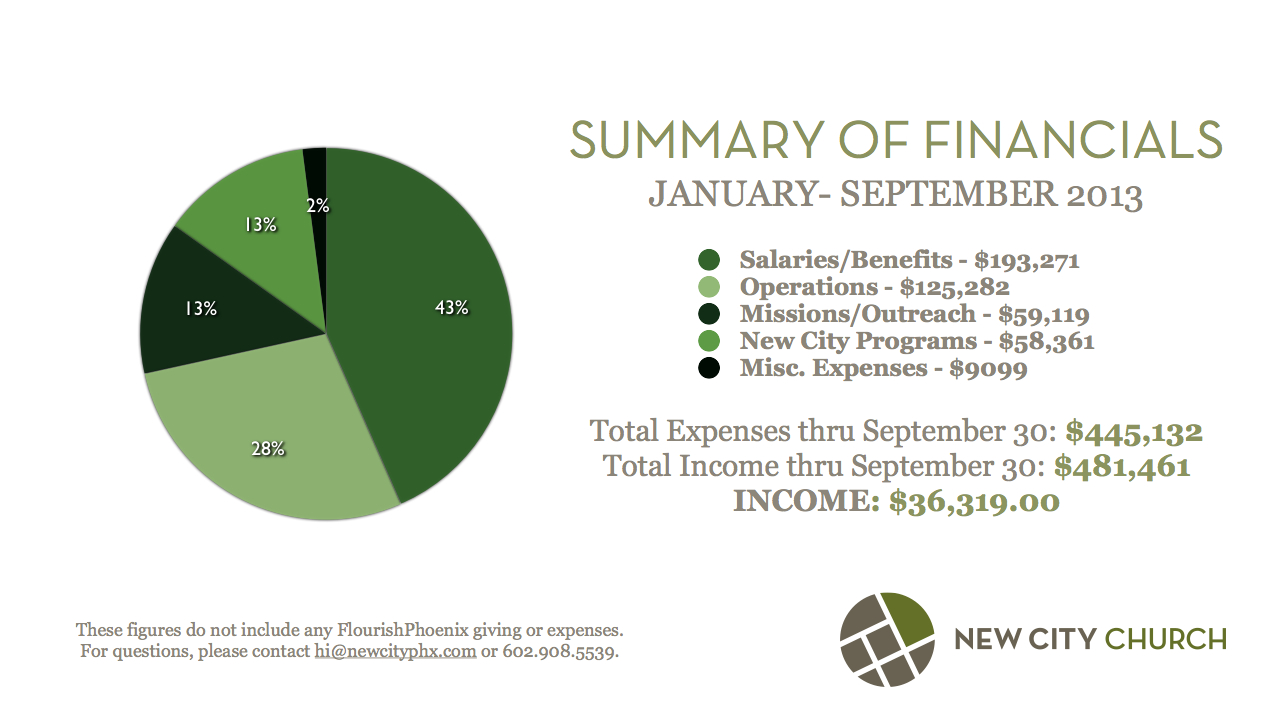 Finally, I’m very encouraged that our salary and benefit expenses are at a level that I know honors our people and our Lord. As we continue to grow, this percentage will likely drop to around 35% but I can tell you in all confidence and honesty that these numbers reflect a healthy church and one with integrity. Please let us know if you have any questions by calling us (602.908.5539) or sending us an email to hi@newcitychurch.affaridev.com.